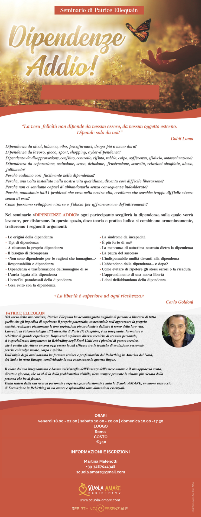 Super seminario che mi ha permesso di capire qual è la “radice” della mia dipendenza e di liberarmi di questa dipendenza durante la respirazione. Molto potenti i concetti sui tipi di dipendenze, gli esercizi, le condivisioni. Perfetto! Grazie infinite Patrice.