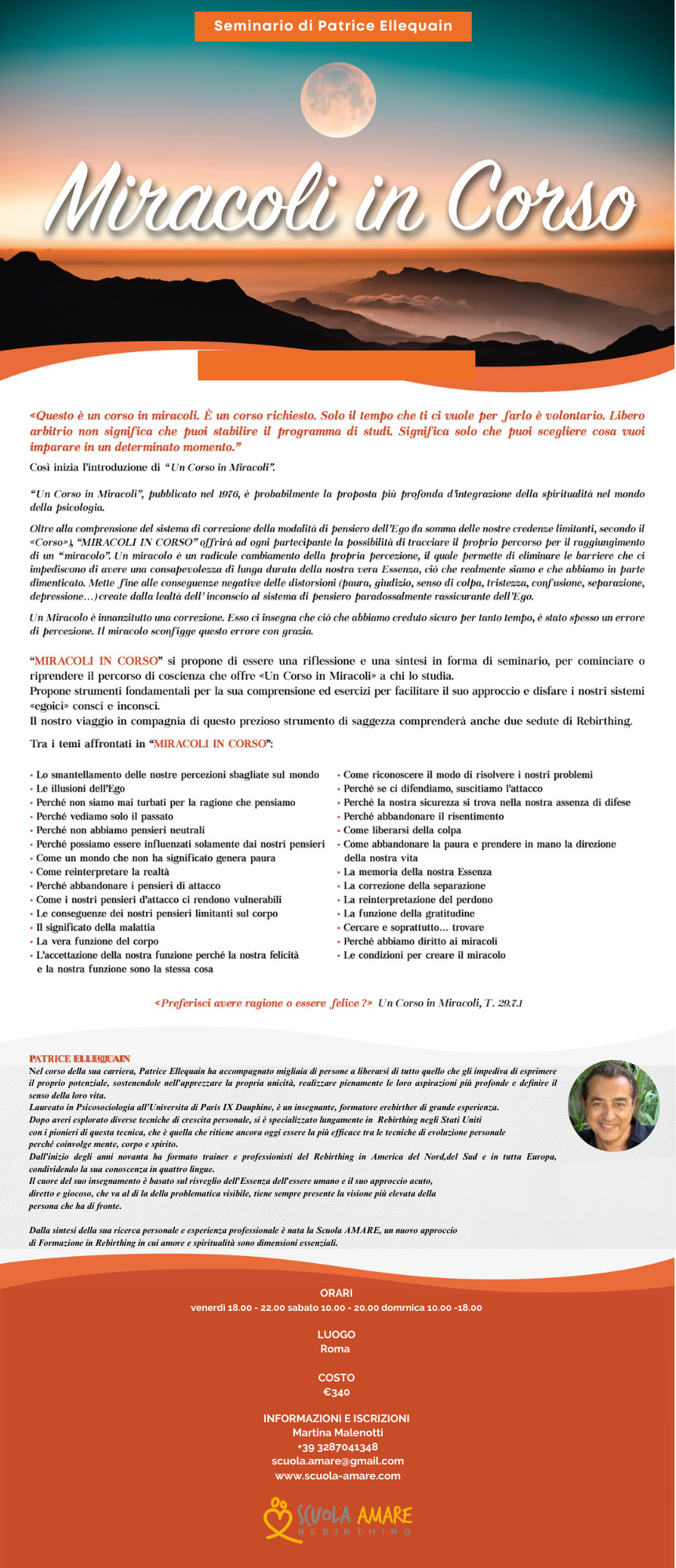 “MIRACOLI IN CORSO” si propone di essere una riflessione e una sintesi in forma di seminario, per cominciare o riprendere il percorso di coscienza che offre «Un Corso in Miracoli» a chi lo studia.